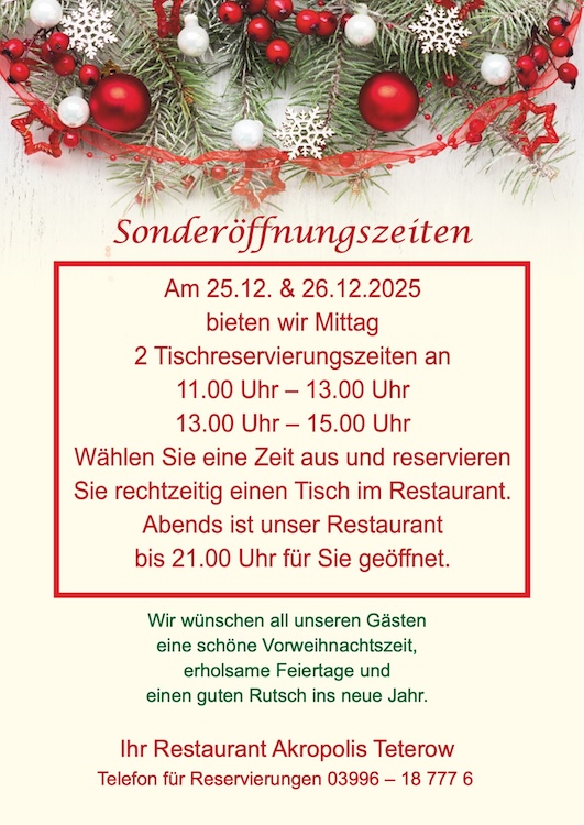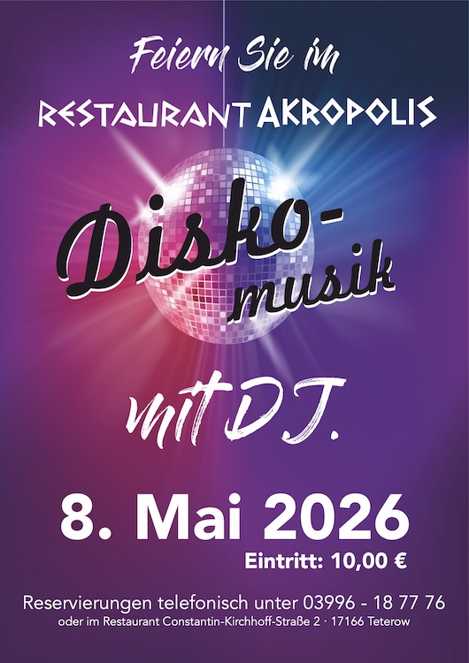 In unserem Restaurant verwöhnen wir Sie mit einer großen Auswahl an griechischen Köstlichkeiten und hervorragenden Weinen. Unser griechisches Restaurant bietet Ihnen viel Platz und eine angenehme Atmosphäre. Bei schönem Wetter können Sie sich auf unserer Sommerterrasse verwöhnen lassen. Für besondere Anlässe und Feierlichkeiten wie Geburtstage, Hochzeiten oder Firmenfeiern bieten wir ausreichen Platz. Wir würden uns freuen Sie recht bald in unserem Restaurant Akropolis in Teterow begrüßen zu dürfen.
